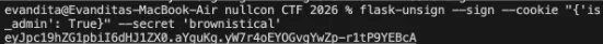 Here we find the secret key to be ‘brownistical’. Next, let’s try to forge our newly modified cookie session that allows us to get admin access.
