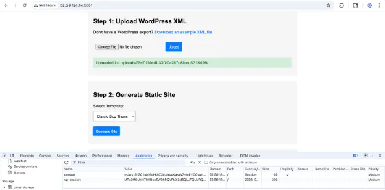 Accessing the web page, we can generate a static wordpress site using an xml. In the /generate api, we can send this response
